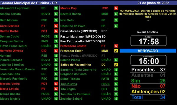 Para que a cassação sugerida pelo Conselho de Ética fosse efetivada, era preciso que a maioria absoluta dos vereadores da Câmara Municipal de Curitiba se manifestasse favorável à cassação